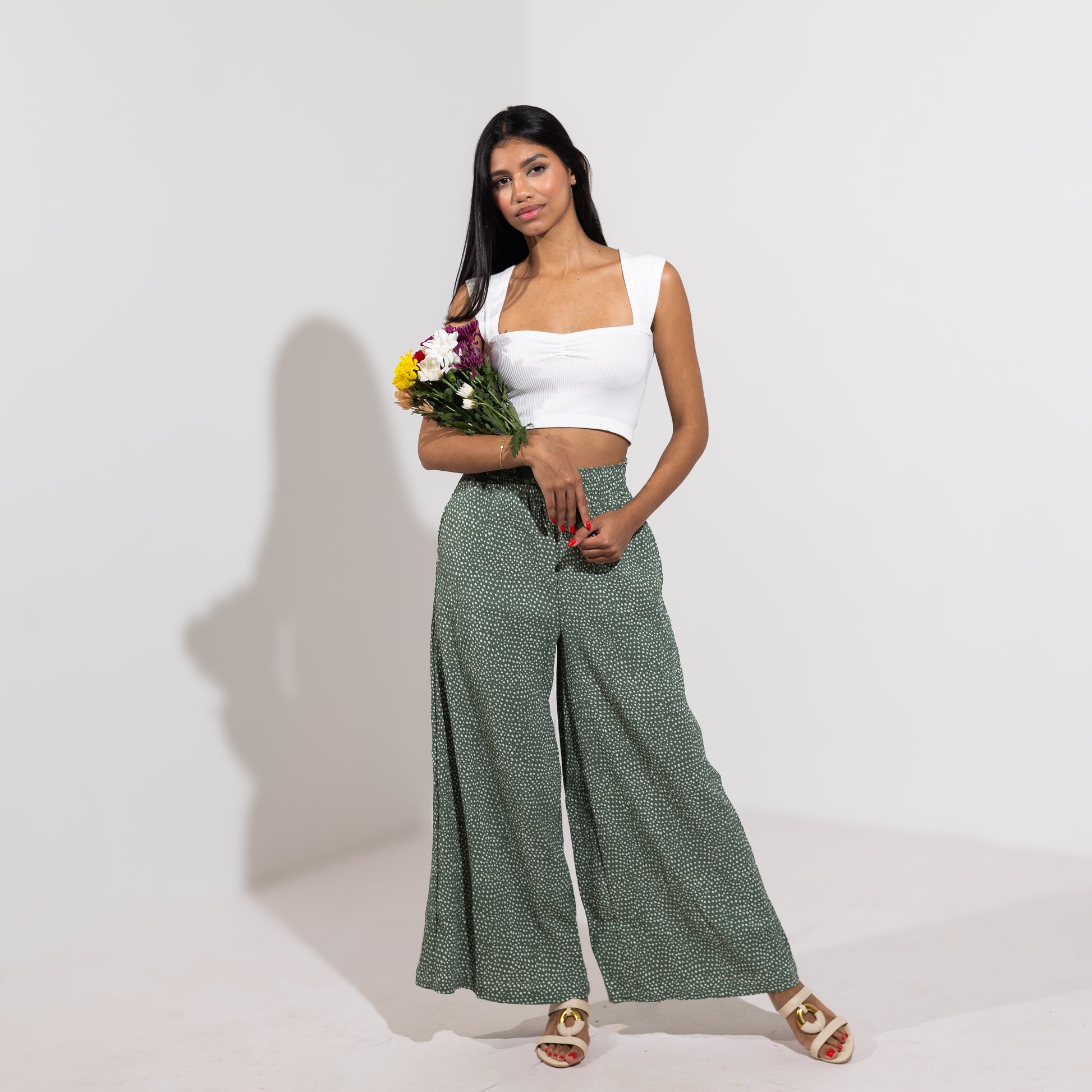 Un palazo de corte amplio con estampado delicado que combina comodidad y estilo. Su diseño ligero y fluido lo convierte en una pieza versátil, perfecta para crear looks frescos y elegantes.