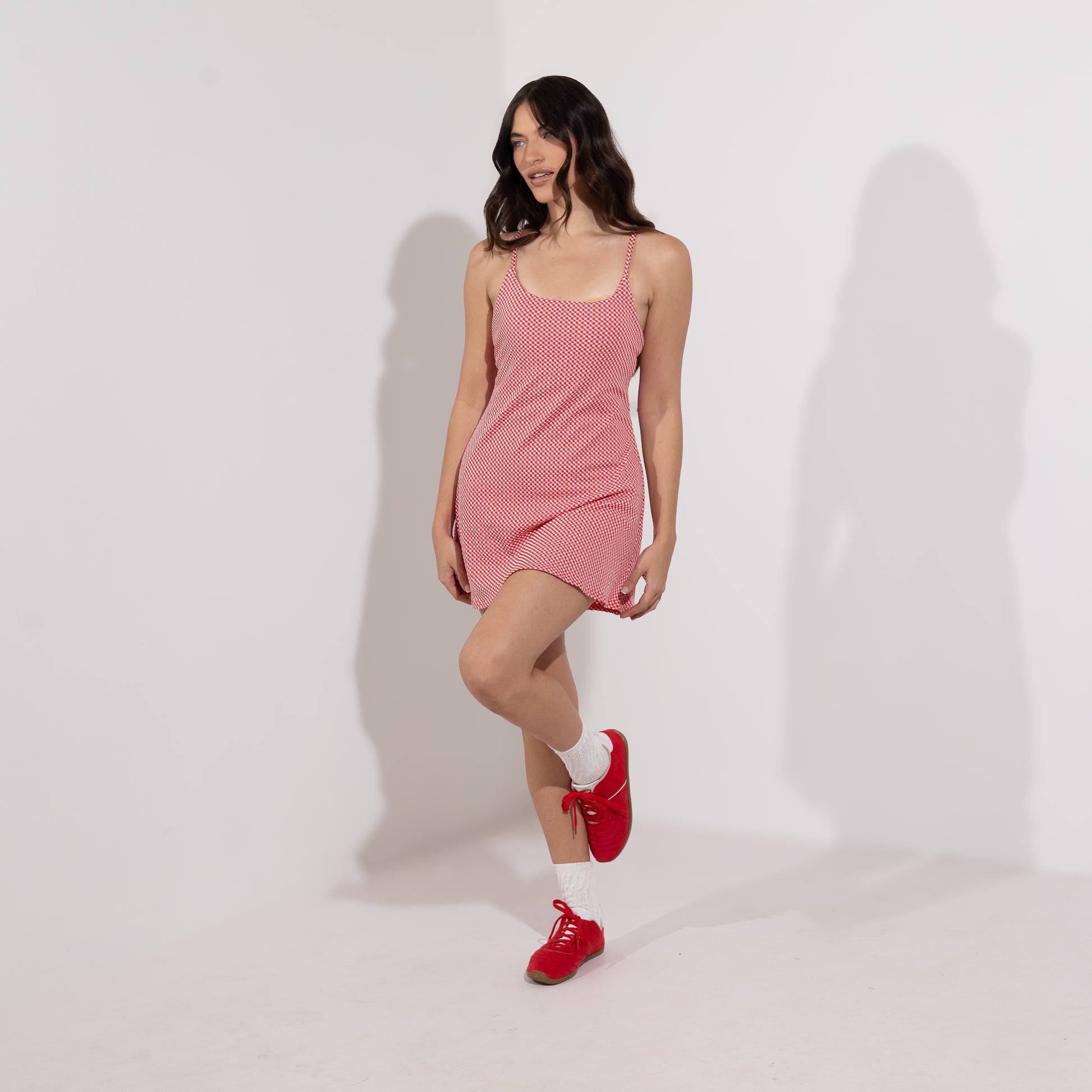 Vestido deportivo con tirantes finos y diseño ajustado que incluye pantalón integrado para mayor comodidad y soporte. Ideal para un look activo, cómodo y moderno.
